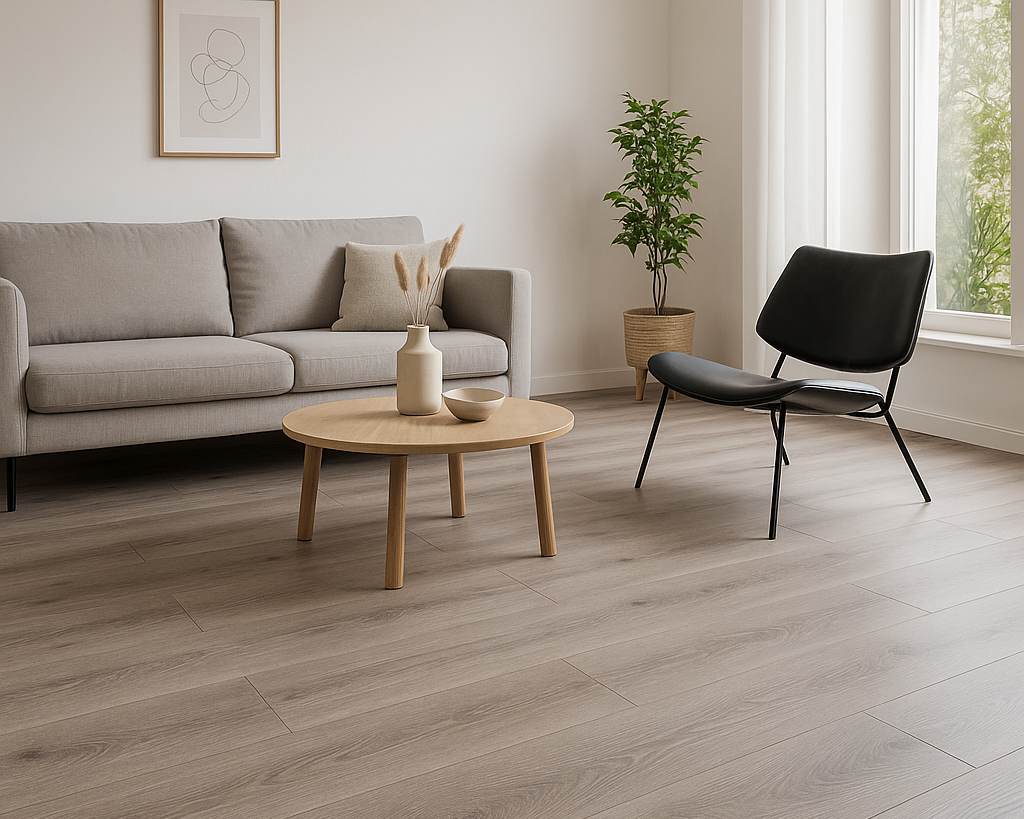 Sol SPC vinyle rigide haut de gamme, effet bois réaliste, avec sous-couche intégrée. Étanche, résistant et facile à poser.